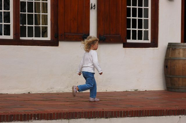 Catherine enjoyed running on the porch of the Cape Dutch building at Blaauklippen.