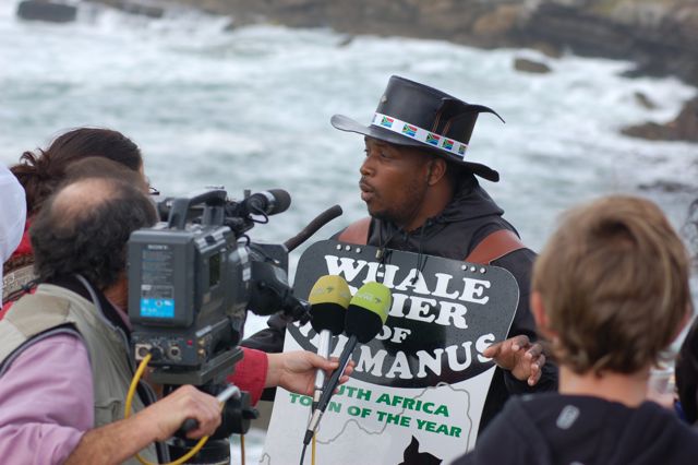 Hermanus takes is whales quite seriously, because they are the source of a lot of tourism for the small town. Since 1992, a Whale Crier, currently Pasika Noboba, has patrolled the shore to announce the presence and location of whales. Mr. Noboba was being interviewed by SABC when I took this photo.