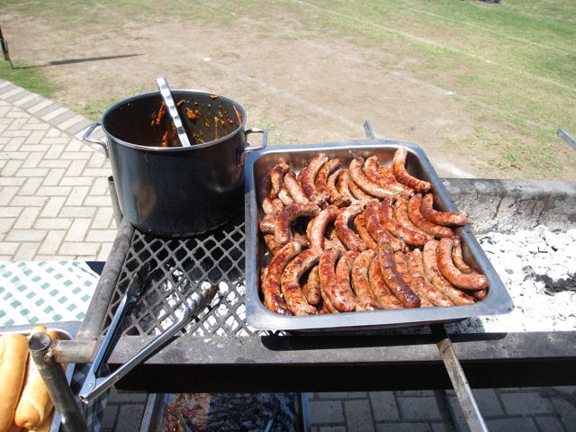 This was my station for the morning. In addition to braaiing, I loaded the boerewors onto the rolls. The pot contains a tomato and onion sauce that customers ladled onto their rolls.